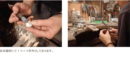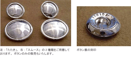 ●ボタンは、シンプルでなおかつ存在感のある市販品が見つけられなかったので、スターリングシルバー(純度92.5%)のオリジナル品を製作しました。メッキ等では出ない、深みのある光沢感があります。