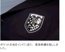 また、写真のブレザーに使用しているエンプレムはインドにジャケット生地を送り、胸ポケットに直接刺繍を施しました。これにより、変な分厚さがない自然な胸周りの装飾になりました。