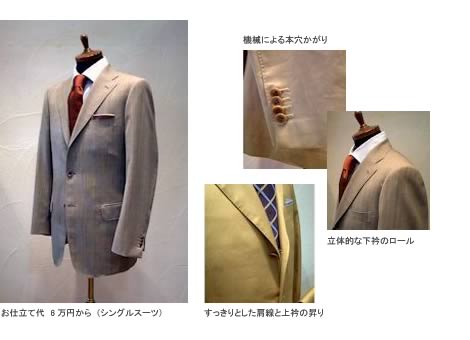 ●イージーオーダー等で使われているコンピュータによる裁断ではなく、熟練した裁断士が直接手で型を起こし、仮縫後の補正も行いますので、ミリ単位の体型補正やデザインの修正が可能です。 ●アームホールが小さく、すっきりとした脇のラインときれいな肩線が特徴です。 ●袖口の本開きとお台場は標準仕様ですが、縫目の片倒しのAMF総ピックステッチや、大身返し等のオプションも可能です。 ●春夏物のシャツジャケットや秋冬物のコート等もご注文いただけます。
